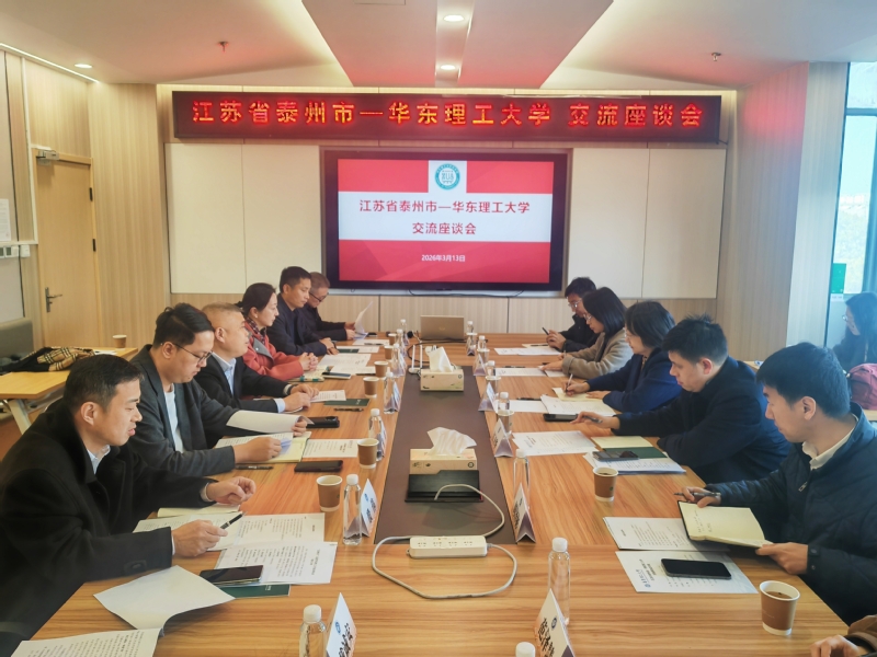 3月13日,江苏省泰州市与华东理工大学校地合作交流座谈会在华东理工大学实验十八楼418会议室举行。泰州市市场监督管理局副局长李萍带队到访,华东理工大学副校长李涛主持会议并致欢迎辞,双方聚焦资源共享与产业升级,就深化校地合作、人才引育及成果转化等议题展开了全面交流。