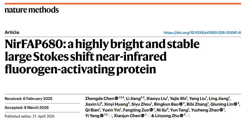 、生物反应器工程国家重点实验室及校光遗传学与合成生物学交叉学科研究中心杨弋、陈显军教授及上海交通大学朱麟勇教授组成的研究团队在近红外荧光蛋白成像技术领域取得突破性进展,在国际方法学权威学术期刊《自然—方法》(Nature Methods)以长篇论文(Article)形式在线发表题为“NirFAP680: A Highly Bright and Stable Large Stokes Shift Near-Infrared Fluorogen-Activating Protein”的研究文章。