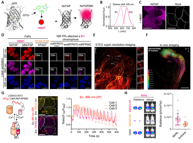 杨弋教授、陈显军教授及朱麟勇教授组成的联合攻关团队以GFP生色团为基础,设计了一种新型近红外荧光生色团HBMT,该生色团兼具背景信号低、光稳定性好和生物相容性好的特点。团队进一步通过定向进化获得了仅由116个氨基酸组成、能够高效激活HBMT荧光的蛋白标签NirFAP,二者形成的复合物NirFAP680量子产率高达0.56。与现有近红外工具相比,NirFAP680在活细胞中亮度较传统近红外荧光蛋白高出1-3个数量级,双光子激发下亮度高于经典小分子荧光染料硅罗丹明,且在单光子和双光子激发下均表现优异的光稳定性。基于这些特性,研究团队成功将NirFAP680应用于活细胞超分辨成像、活体斑马鱼神经网络与发育过程的监测以及活体小鼠神经元成像。利用NirFAP680的大斯托克斯位移和小尺寸优势,研究团队将其与LSSmOrange配对构建了具有高动态范围的FRET系统,实现了药物诱导蛋白质相互作用及胞内钙离子振荡的实时监测;此外,还将NirFAP680与青色荧光素酶NanoLuc融合开发了超亮近红外生物发光蛋白NirNL,基于该系统的蛋白质相互作用检测信噪比高达311倍,远超以传统荧光蛋白为能量受体的BRET系统。